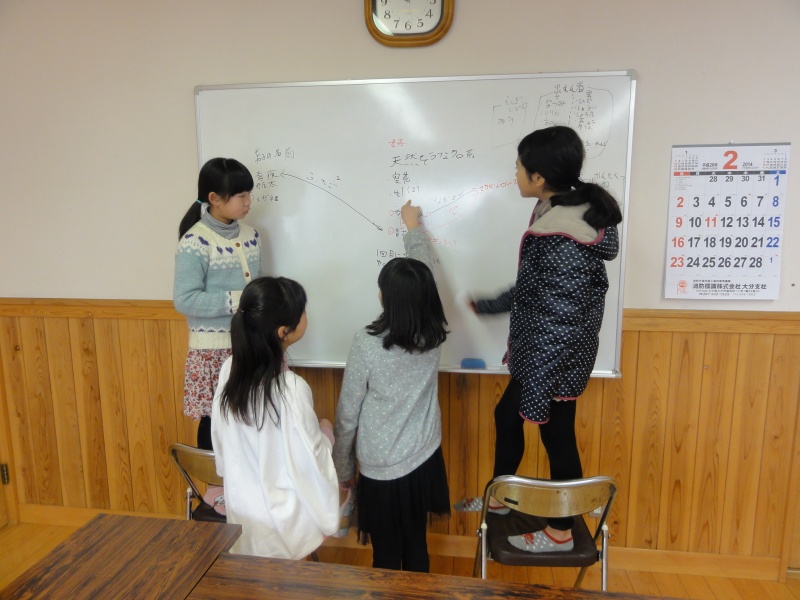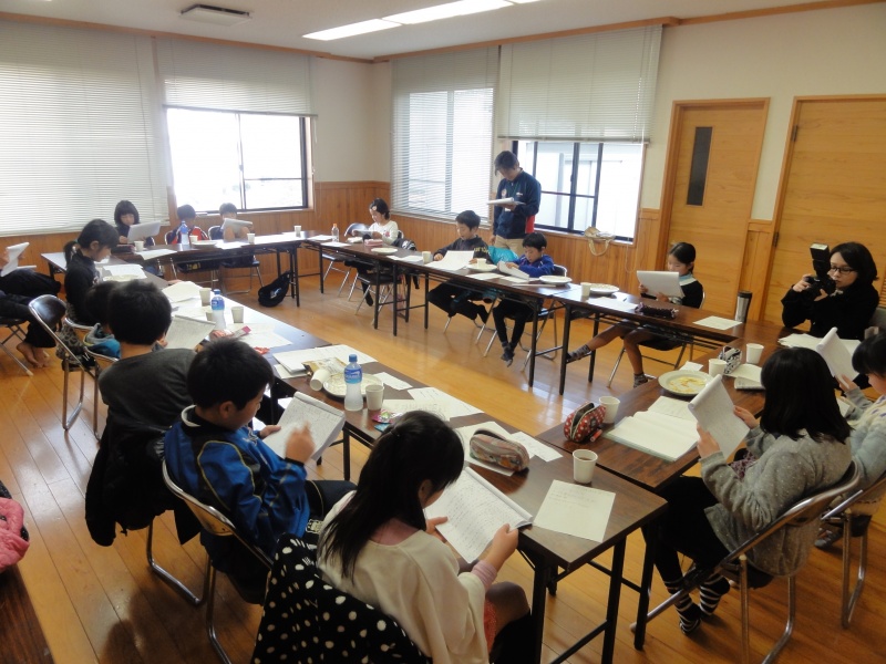 午後2時より全員で役決めです。重なったところは例により目を瞑って挙手で決めました。役が決まったところで読みの稽古をしました。大分合同新聞さんが取材に来ました。子どもたちは丁寧に答えておりました。