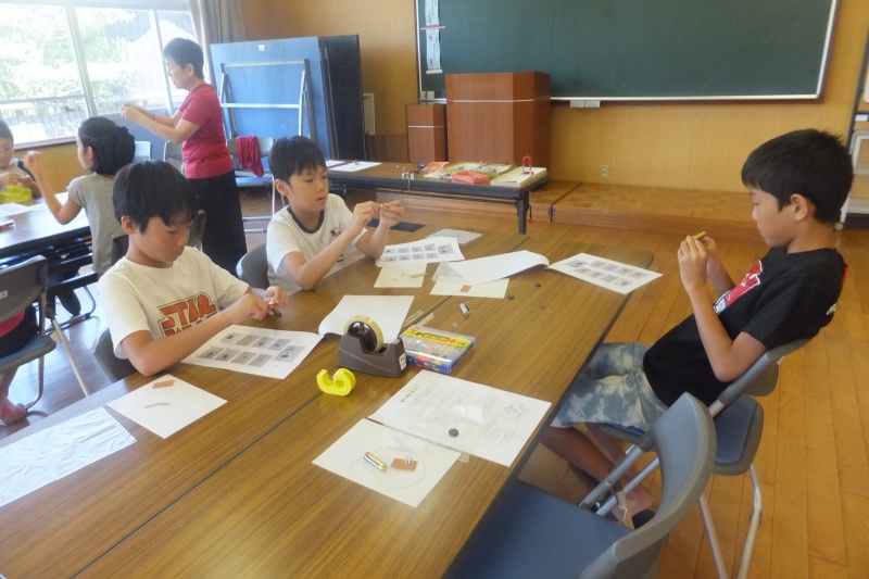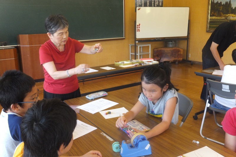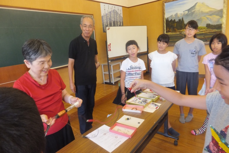 オーラボの出前講座を活用して、講師に元大分高専教授の青木照子先生を招き「電気と磁石で遊ぼう」をテーマに簡単な科学実験を体験しました。