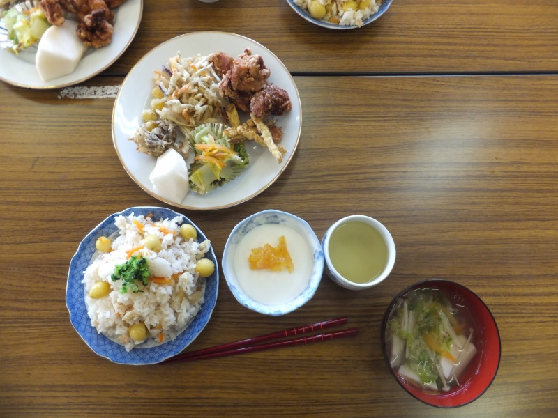 今回のメニューは銀杏ご飯と唐揚げ。皆さん、普段からされているだけあって上手です。先生も教えることないのでは?