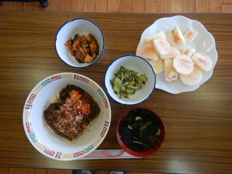 この日の献立は、ナスの蒲焼き丼、キュウリとナスの酢の物、冷たいお吸い物の3品。
