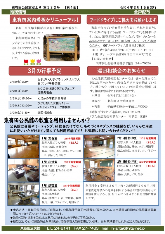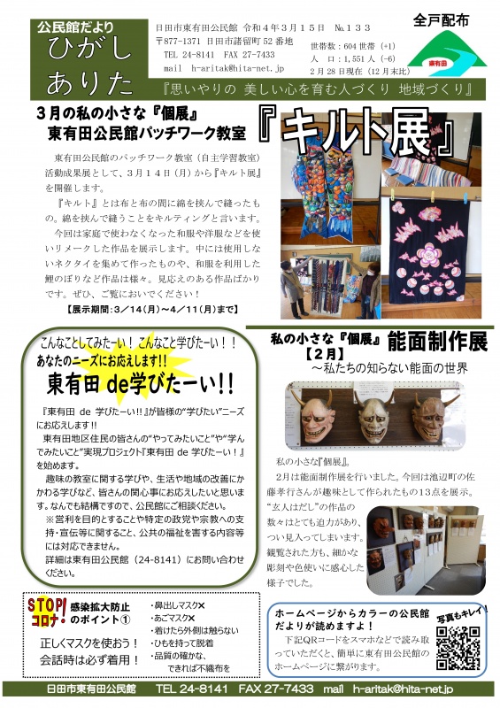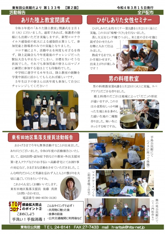 『公民館だよりひがしありた』第133号を令和4年3月15日付けで発行しました。