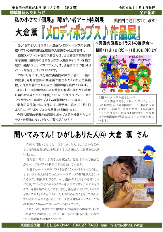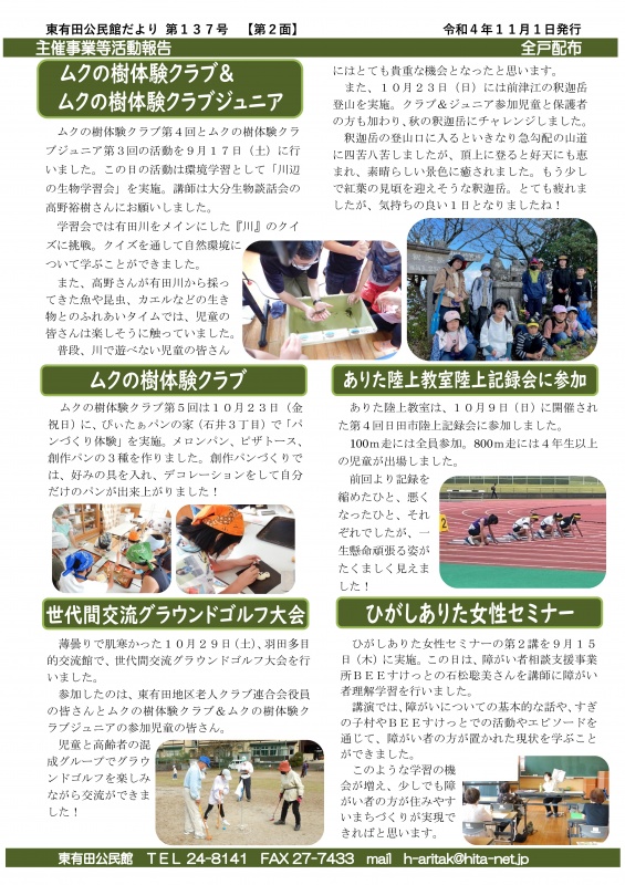 『公民館だよりひがしありた』第137号を令和4年11月1日付けで発行しました。