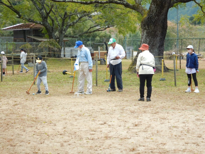 世代間交流グラウンドゴルフ大会は、東有田地区の高齢者と小学校児童とのふれあい活動の一環として実施するもので、東有田地区老人クラブの皆さんとムクの樹体験クラブ&ムクの樹体験クラブジュニアの児童が参加して行いました。