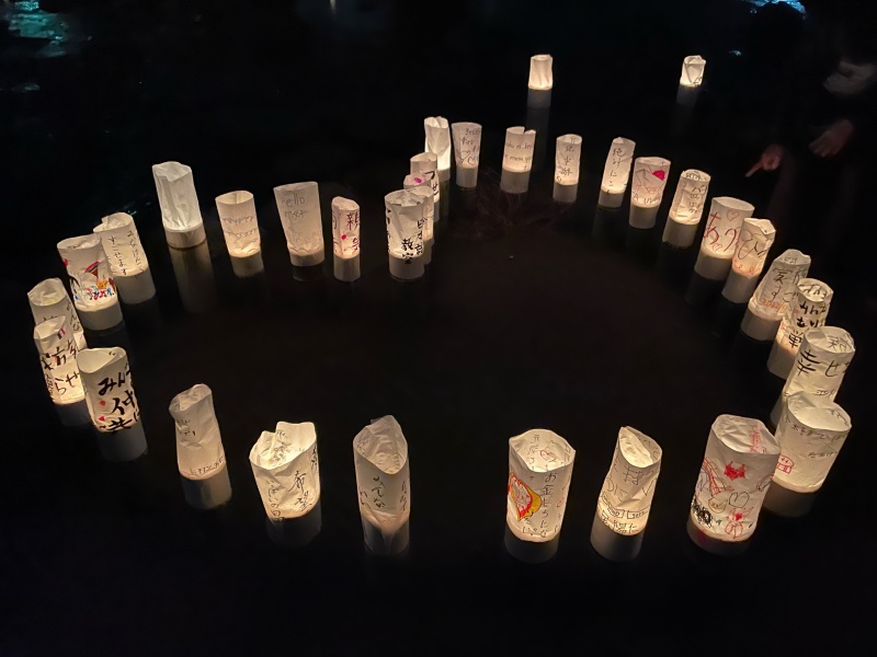 竹灯籠は11月11日から3日間、ハートの形に置かれ、御幸橋の下に飾られました。