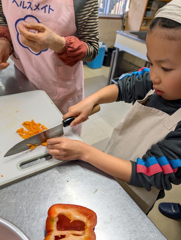 包丁を使う場面では、見ている側はハラハラドキドキ。でも、子どもたちは安全に気をつけながら、とても上手に調理していました。ケガもなく、美味しい料理が完成しました!