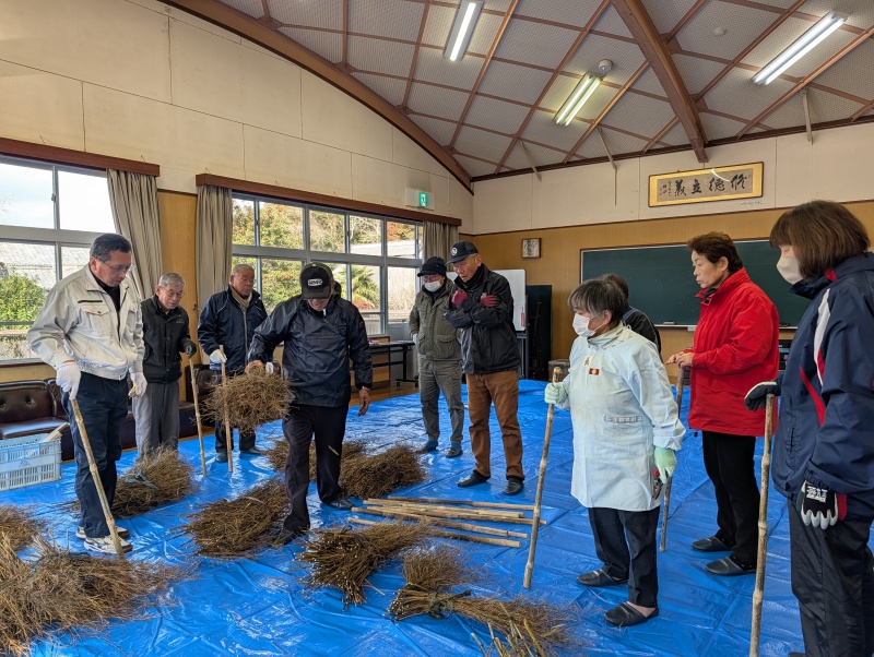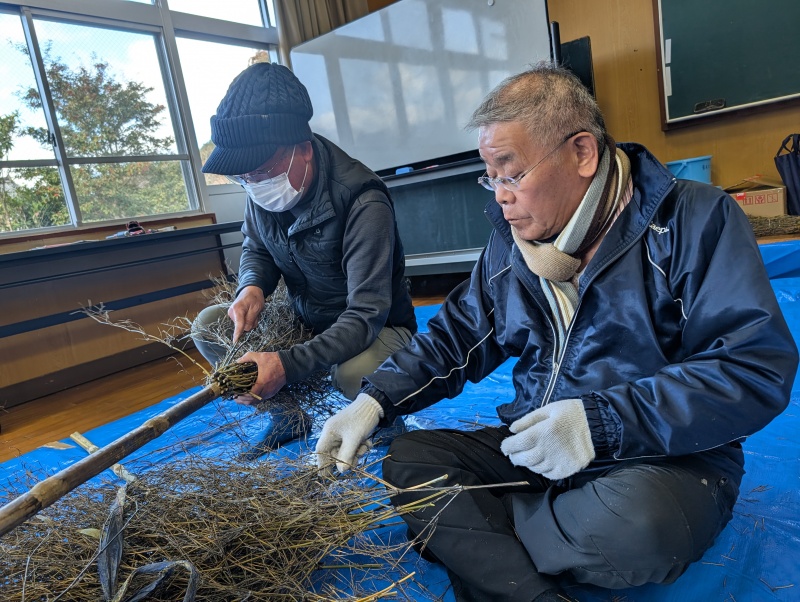 2年ぶりに開催された、宿利自治会長による竹ぼうきづくり講座。