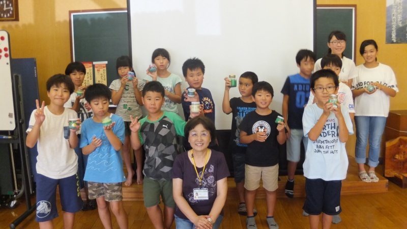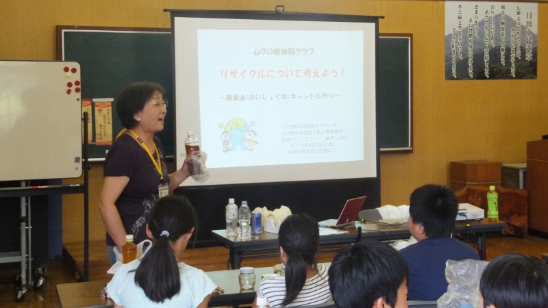 大分県環境教育アドバイザーの綿末しのぶ先生を招き、講演と廃油キャンドルを作りました。