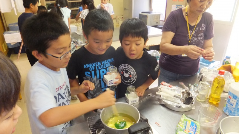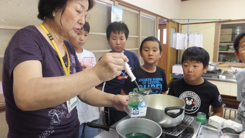 その後、調理室に移動して廃油キャンドル作り。子ども達が持ってきた廃油に凝固剤とクレヨンを入れて、温めて溶かします。