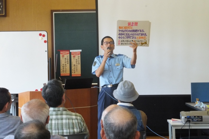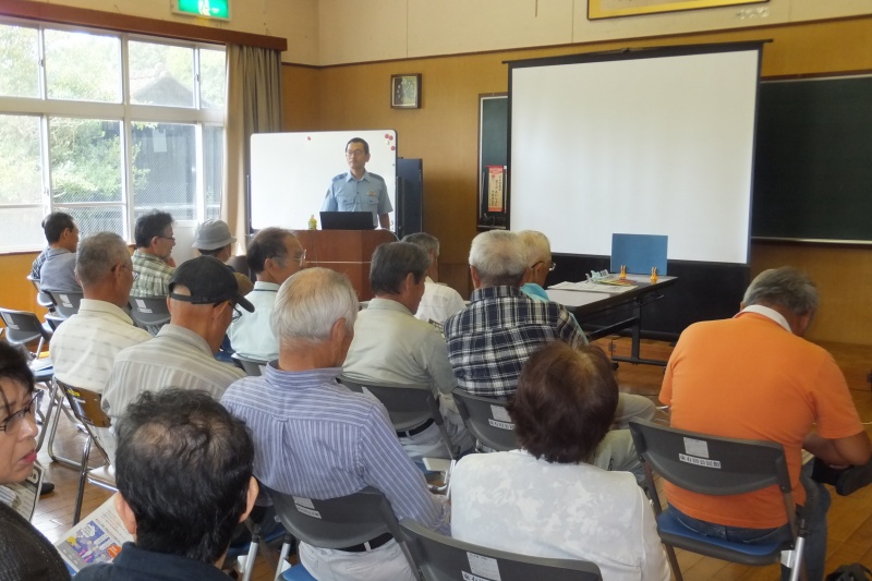 講話のなかでは特殊詐欺にも色々な種類があり、決してATMでお金が返ってきたり、警察官が通帳・お金を預かることは絶対にないので注意してほしいと話し、クイズ形式で質問したりと、皆さんも熱心に聞き入っていました。また交通安全では、夜間歩くときには反射材を使ってほしいと話していました。
