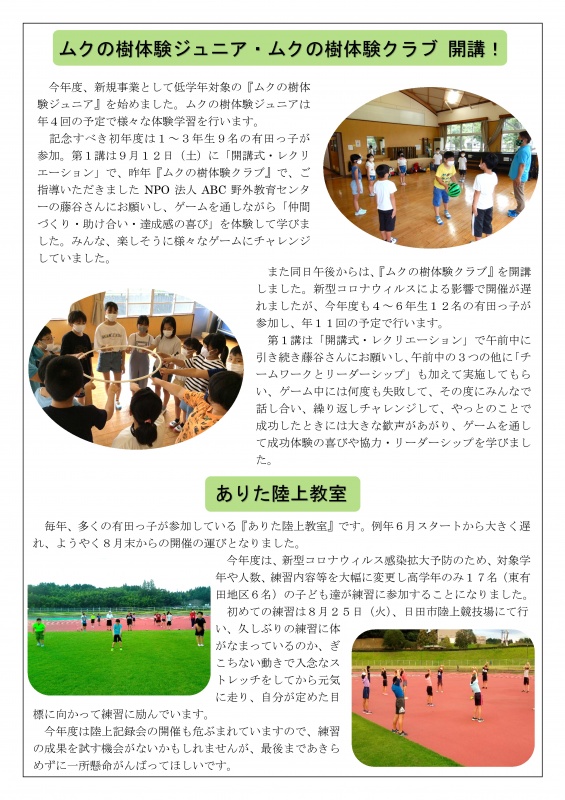 ムクの樹体験ジュニア・ムクの樹体験クラブともに、様々な体験を通して、一回り大きく成長して欲しいものです。みんなと一緒に協力しながら楽しい一年間を過ごしてください。