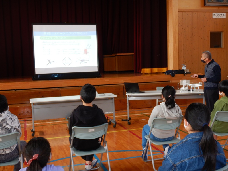 はじめにスライドを見ながらドローンとは一体何なのか?ドローンで何ができるのか?を学びました。