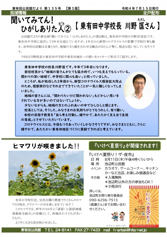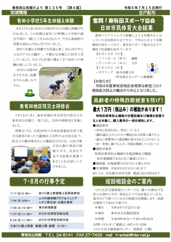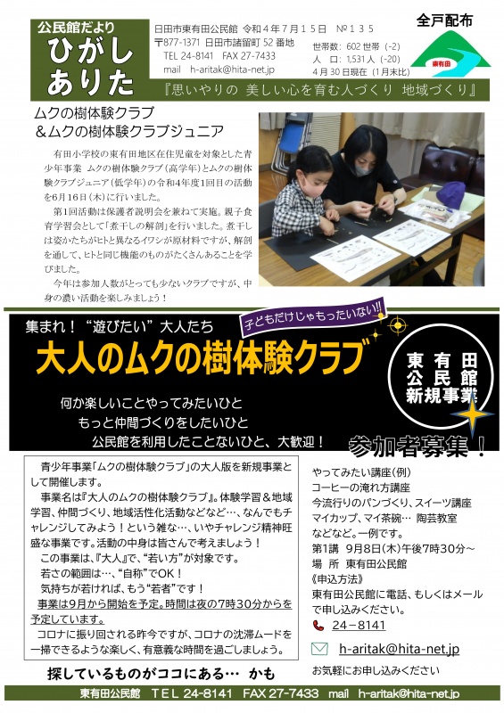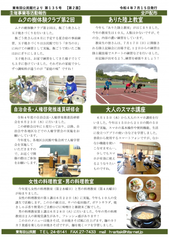 『公民館だよりひがしありた』第135号を令和4年7月15日付けで発行しました。