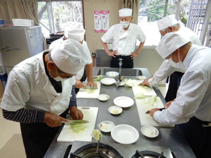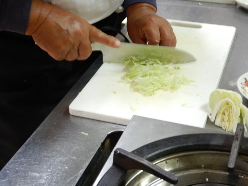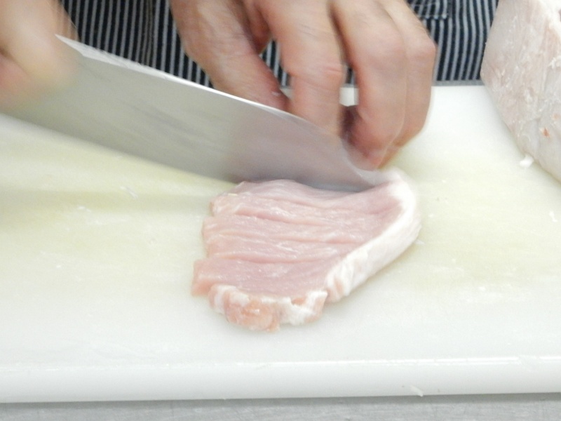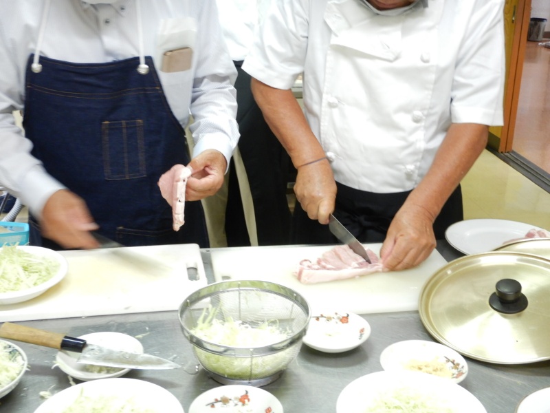 今回は、豚ロース肉のスジ切りや食べやすくするグローブカット(野球のグローブみたいな形)の切り方と、キャベツの千切りのコツを学びました。