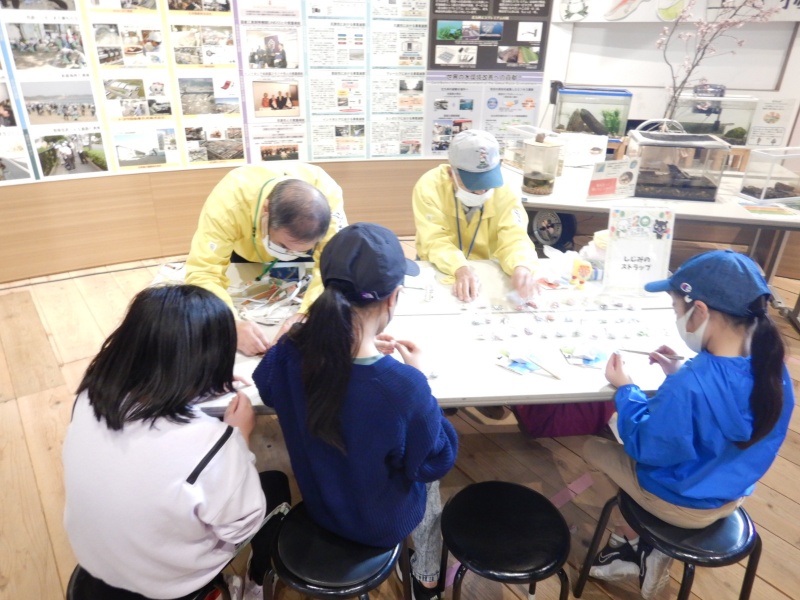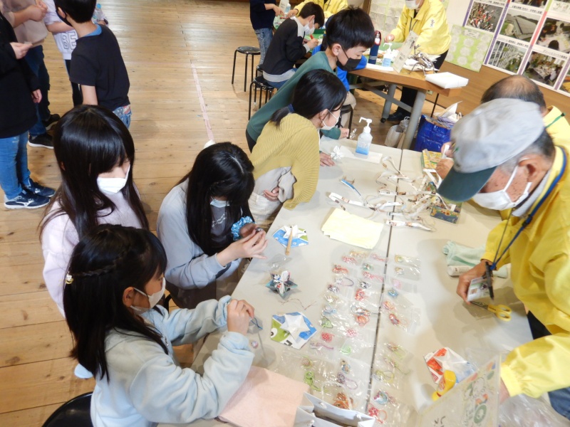この日は、ゴミ(廃材)でつくる工作ワークショップが行われており、参加児童の皆さんはボランティアの方の指導でコマやキーホルダーなどを作りました。