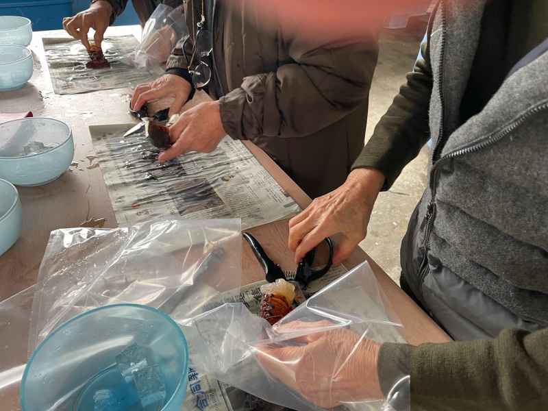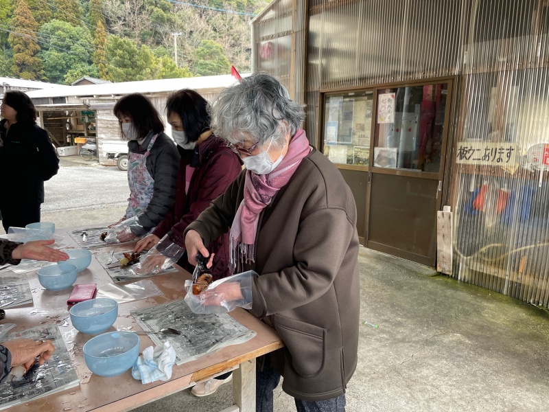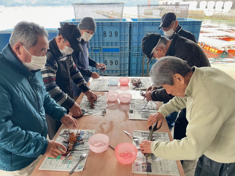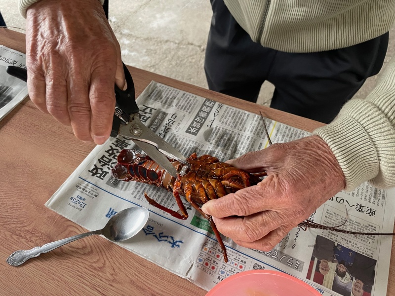 今回は佐伯市蒲江で伊勢エビのさばき方を学習。エビが暴れないよう氷水で仮死状態にしたエビをさばきます。エビの殻から身を外すのにコツがあり、ちょっと苦戦するひともいましたが、無事刺身にすることができました。