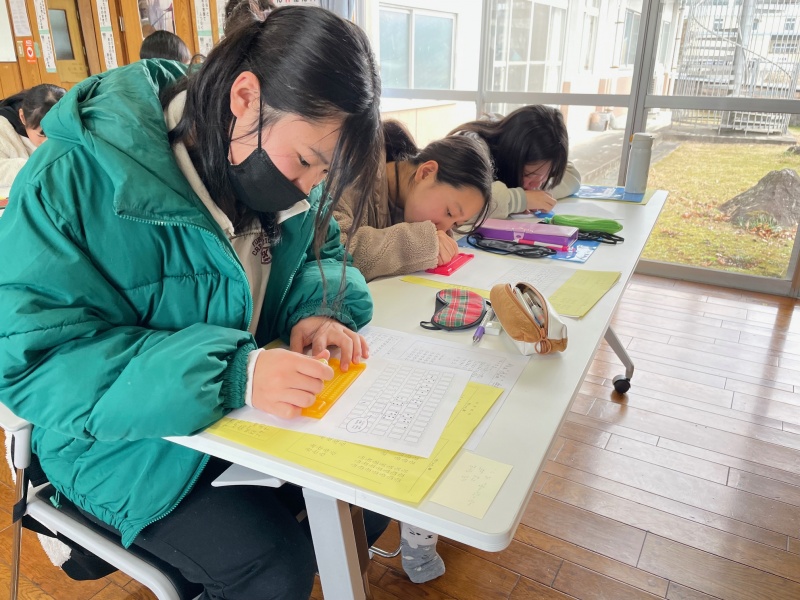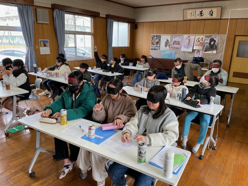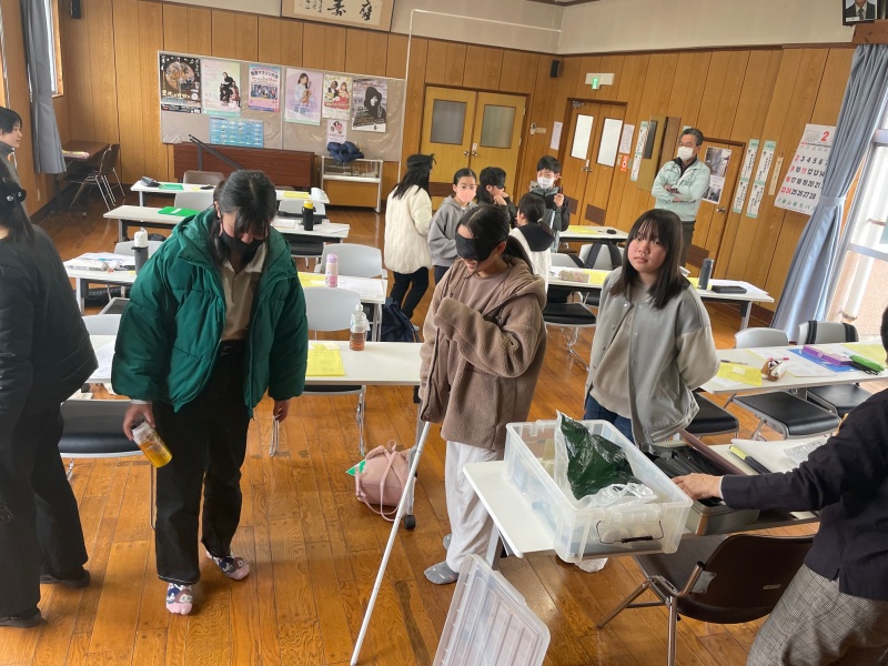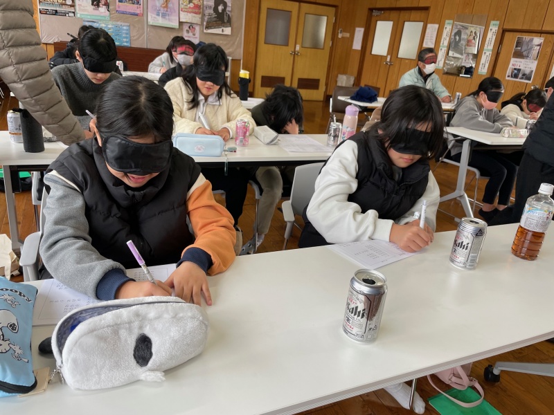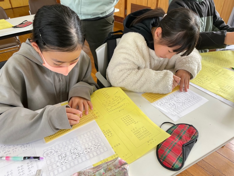 また、アイマスクと白杖で館内を歩いたり、点字の名刺づくり体験をして視覚障がいについて理解を深めました。