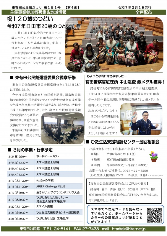 『公民館だよりひがしありた』第151号を令和7年3月1日付けで発行しました。