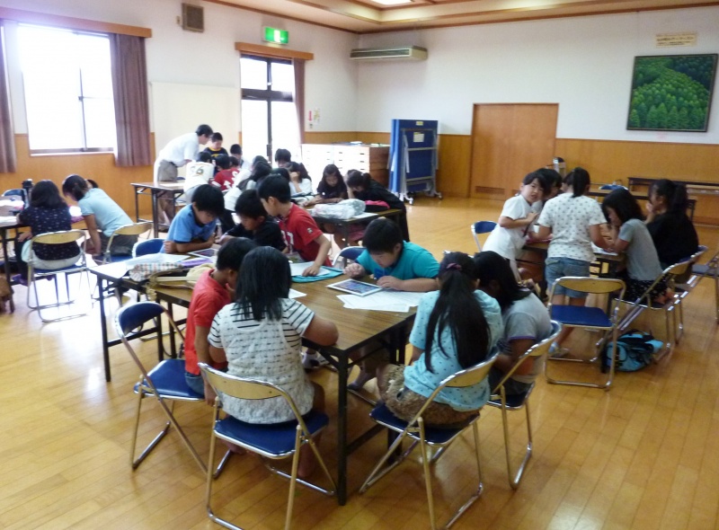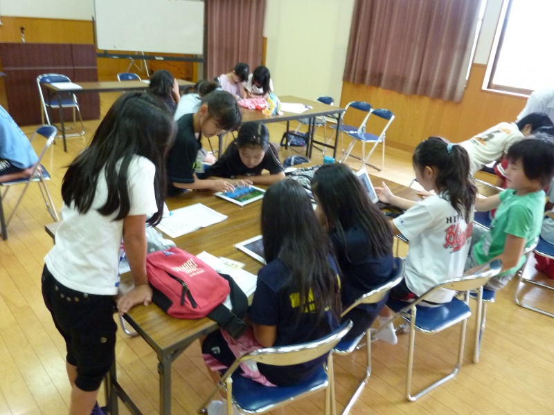 開講式終了後には、「ipadに触れてみよう!」とタブレット式端末(アイパット)を使って色々なことをやりました。スマートホンはほとんど全員が使った経験があり、ipadも1/3の子が使ったことがあるということで、子ども達に基本操作を教えた後は、各自スムーズにipadを使いこなしていました。