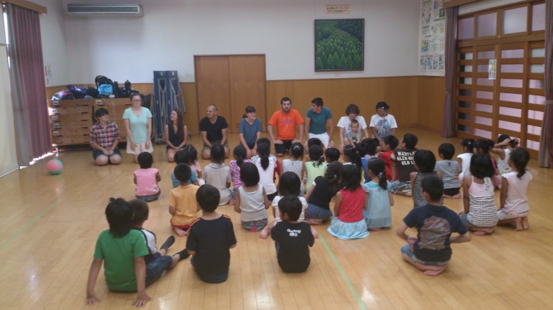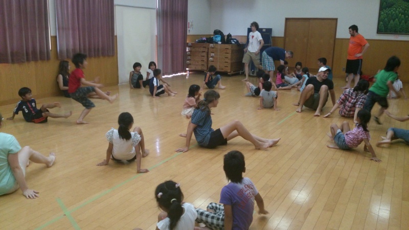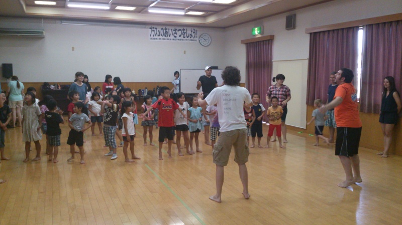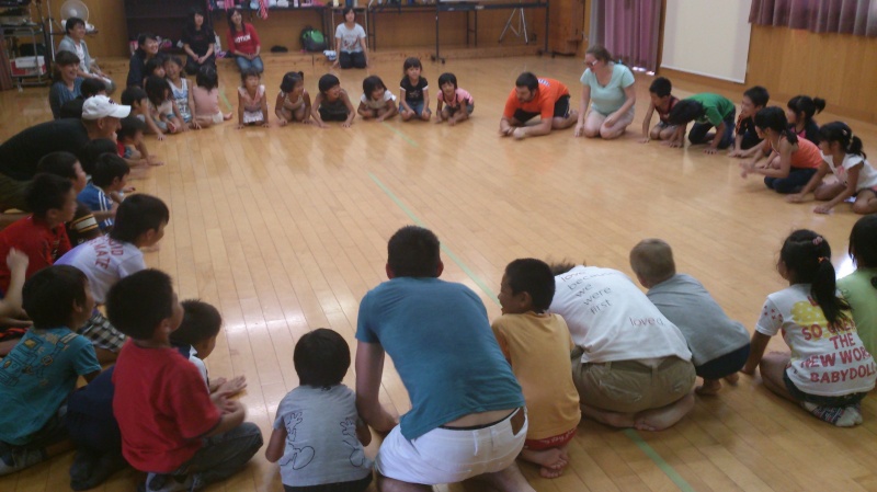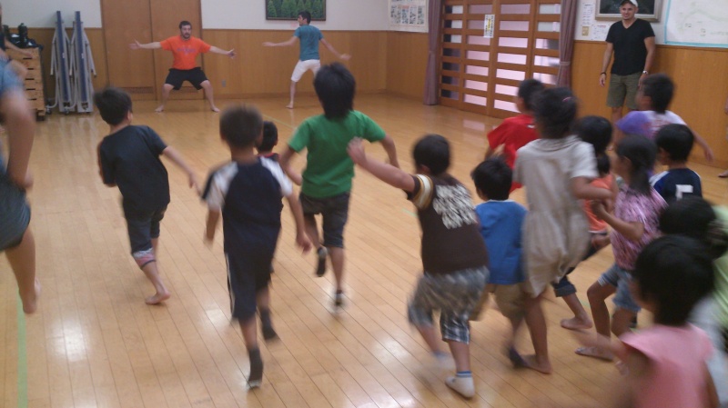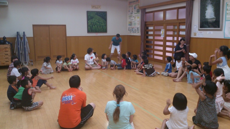 なつの体験教室に参加しているのは、日隈小学校1年生〜3年生の児童です。初め身近に出合う外国の高校生に、ハイタッチであいさつができず、物怖じする子もいましたが、遊びを通じ時間が経つにつれ慣れてきました。