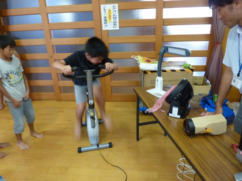 最後に自転車発電機を使って、自分たちの力で発電してみました。