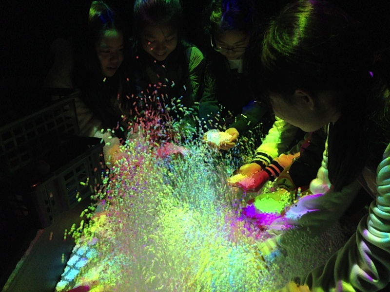 動き回る光の的にボールを当てるとビーズの大噴水が起こったり、動きに合わせて光の粒が