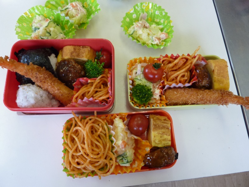 メニューはおにぎり、エビフライ、ケチャップスパゲッティ、ポテトサラダ