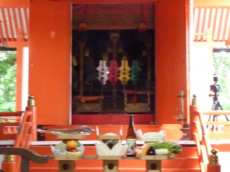 神事では、特別の記念事業と年に一度の清掃以外では開けられることのない神殿の扉が開かれ、大原八幡宮の橋本神官が御簾を挙げ、氏子一同は3柱に参拝することができました。