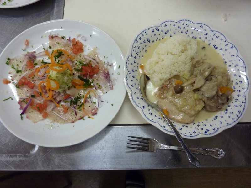 メニューは若鶏のクリーム煮、バターライス、カルパッチョです。
