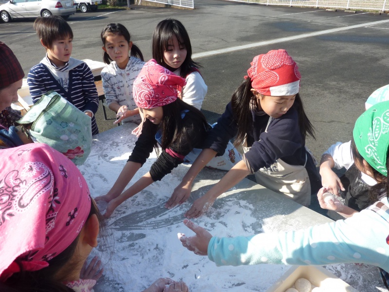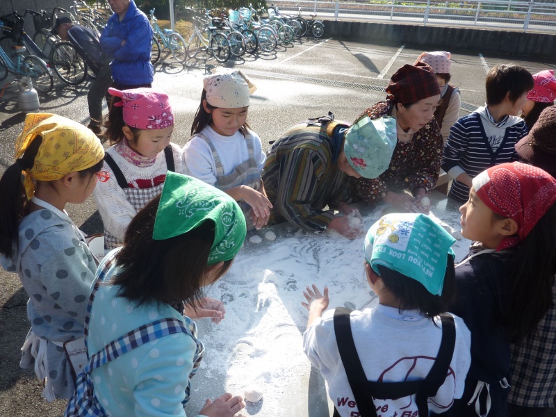 杵を振るタイミングが難しく杵同士がぶつかるなど苦戦はしていましたが、きれいなおもちがつけました。又、もちを丸めるのも初めてで、こちらもおばあちゃん達が丁寧に教えていました。