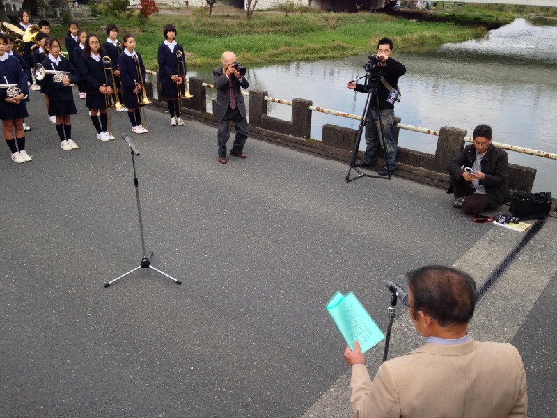 式典の最後には、日隈公民館三味線教室の皆さんの演奏と日隈小金管バンドの演奏・行進を行い、新亀山橋から現・亀山橋に向かって演奏するといった演出もありました。