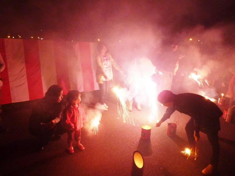 亀山橋の上に竹灯篭を置き、灯篭の火で照らされた橋の上で子ども達が手持ち花火をするといった演出が行われました。