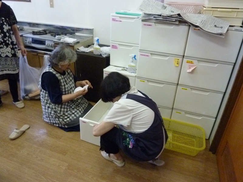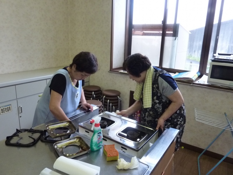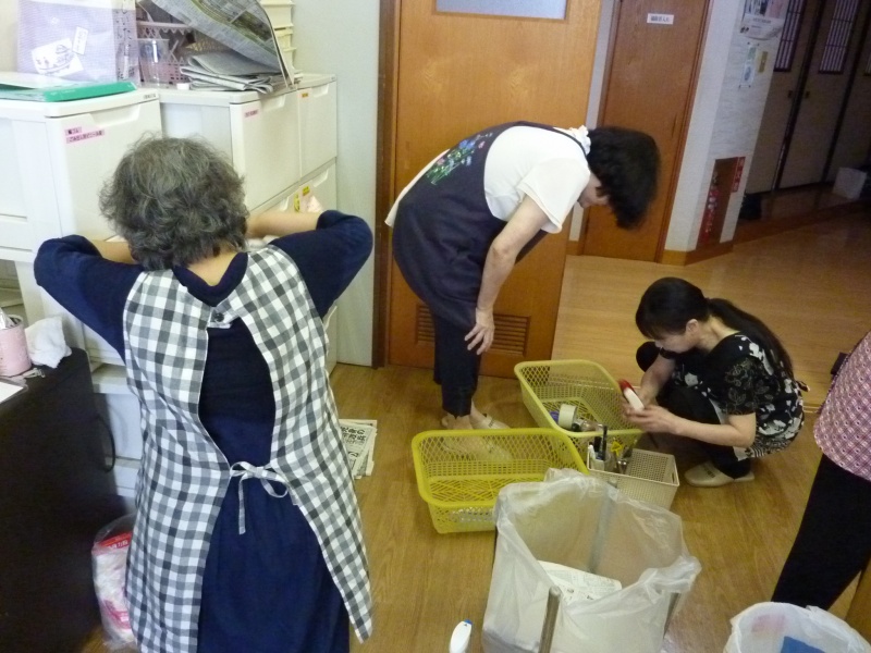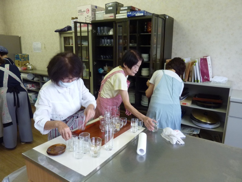 講習室は、ガスレンジまわりやシンクタンクの内部や棚、食器棚を徹底的に磨き上げてくださいました。料理教室等で使用した道具類は、利用者がその都度きれいにしていますが、そのほかのところは、平素はなかなか清掃が行き届かないのが実情です。また、玄関のガラスもきれいに拭き上げてくださいました。暑い中、汗を流して、ひたすら取り組んでくださった社協の皆さん方のご厚情に、深く感謝申し上げます。