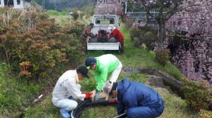 まつりの後、髙畑橋の横、枝垂れ桜の下で消防ポンプの点検が行われましたので、そちらの様子もご紹介♪