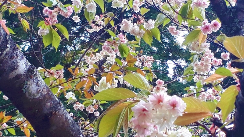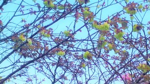 黄緑色の花を咲かせる桜は、御衣黄(ギョイコウ)桜と鬱金(ウコン)桜があるようです。御衣黄桜は緑色、鬱金桜は黄色という印象らしいのですが、よく似ているようです。2種類の違いは花弁のピンク色への変わり方がその一つのようです。