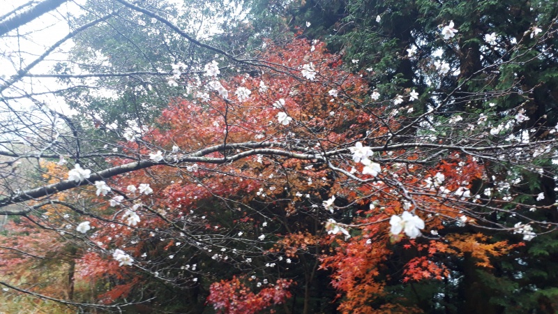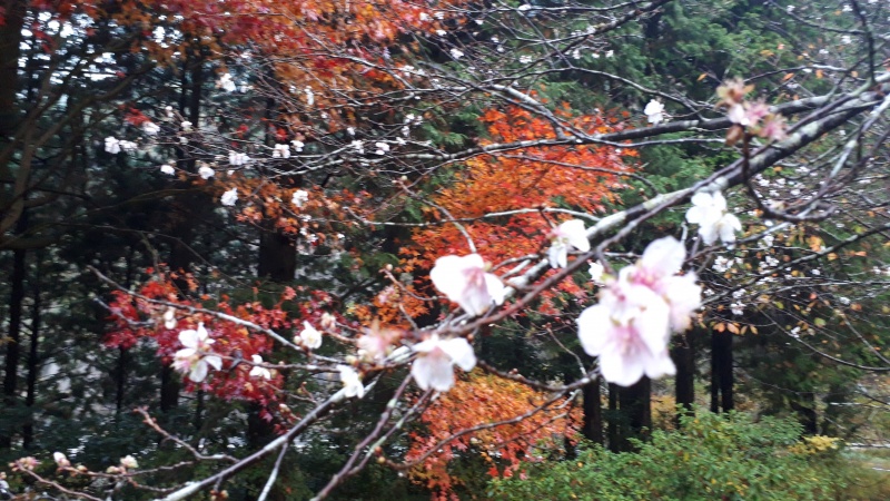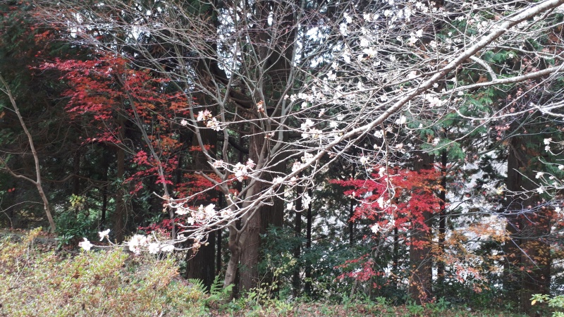 後ろの紅葉の紅色とのコントラストが美しくもあり、不思議な感じもしますね。