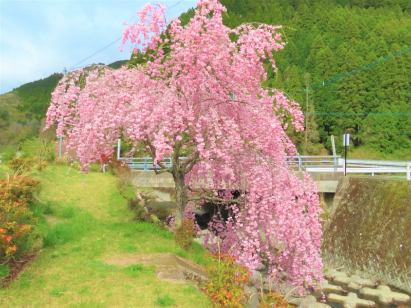 最初は枝ぶり見事な、川原の幸又にあるエドヒガン桜。日田市指定の天然記念物です。樹高が15m程もあり、エドヒガン桜の巨樹としては珍しいのだそうです。 樹齢は推定300年ですが、地元では「千年桜」と呼ばれています!