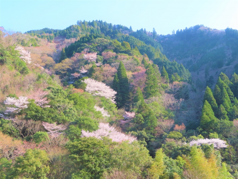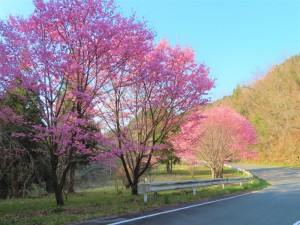 さらに国道を熊本・菊池方面に向かうと、川向うの山肌に桜の薄桃色が見えて綺麗です!