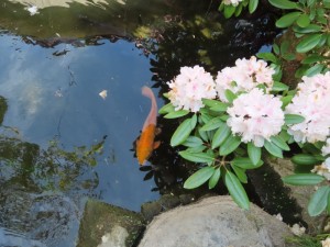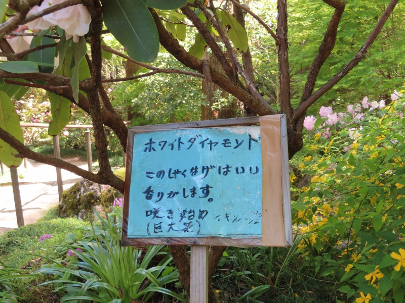 斜面の中腹に、小さな屋敷と滝があって、池には鯉が泳いでいます。トイレもあり、苗の販売も行われています。飲み物も売ってますよ♬ ここにあるホワイトダイヤモンドというシャクナゲは、いい匂いがして、大きな花が特徴です。