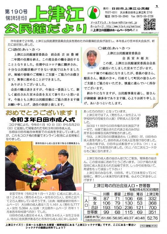 上津江公民館だより第190号(R3/5/15)アップしました!