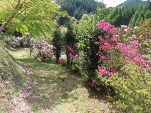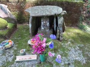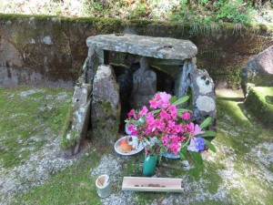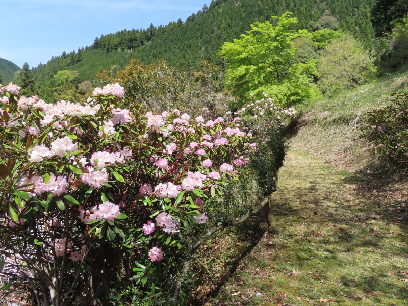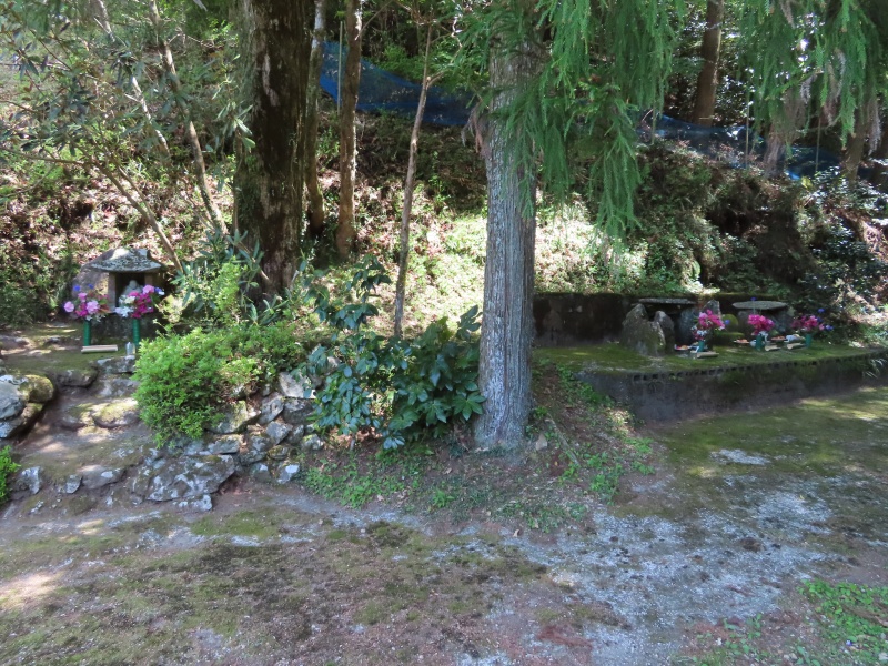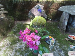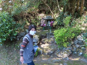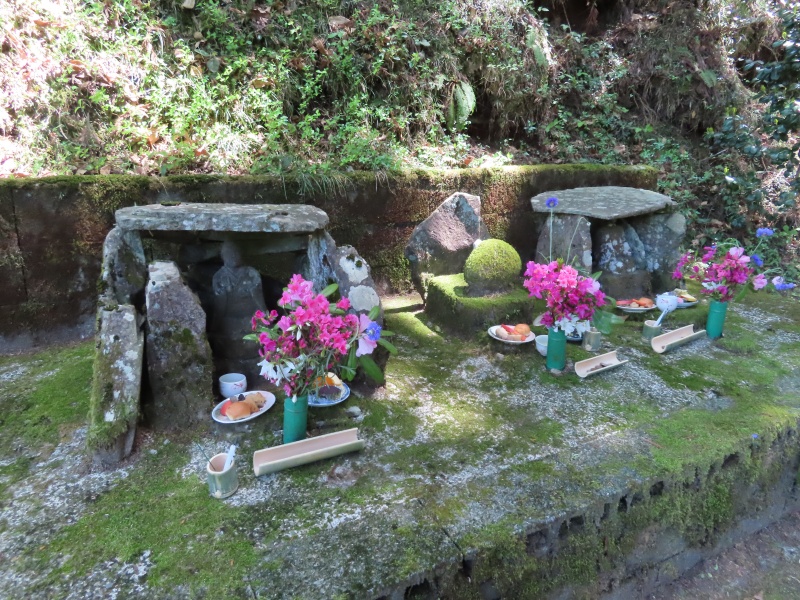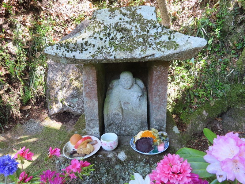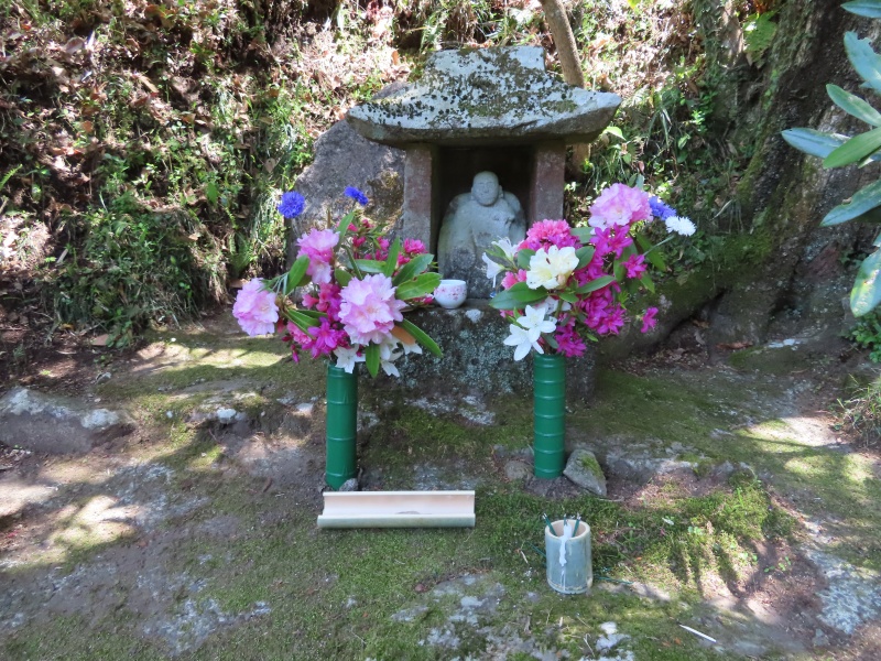 白草公民館からチーゴ岳、熊戸方面に続く道に入ってすぐに脇道に入ると、細い道沿いに柘植の木やきれいなシャクナゲが咲いていて、その奥にお大師様が祀られています。きれいに掃除され、お供物が供えられていました。