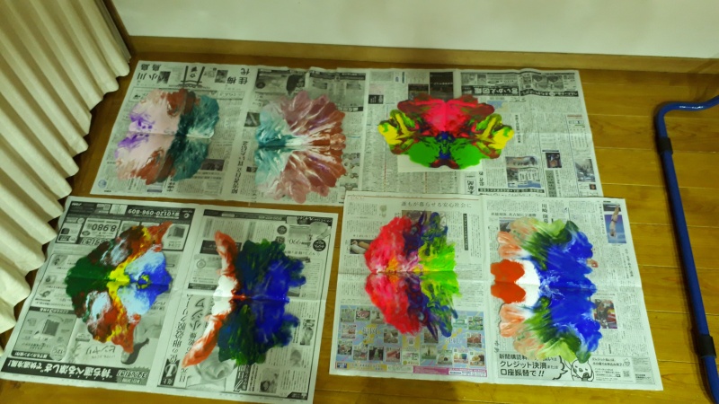 デカルコマニーとは、何色かの絵具をのせた紙を2つ折りにして圧力をかけ、開いた時にできる模様を楽しむ技法です。