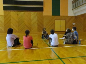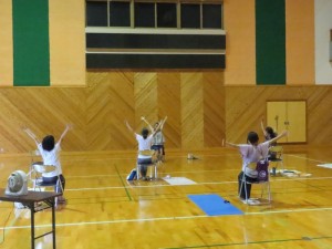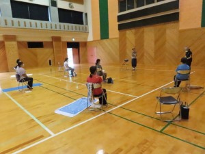 体育館で十分にスペースを取っての活動。かなり暑い日でしたので、熱中症を防ぐため、マスクは適宜外しながら行っています。