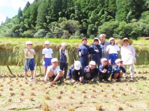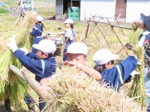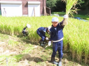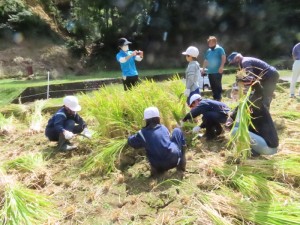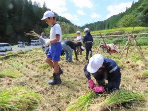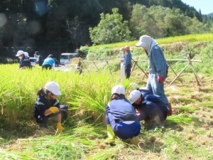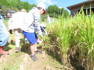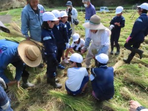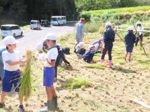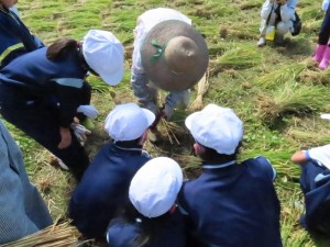 「こうやって刈るんだよ!」「手を切らない様にね。」地域の先生の指導で、子ども達は一生懸命刈り取っていきました。