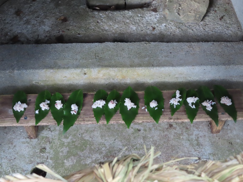 歳の神様では、12枚の葉っぱに少しずつ小豆飯を乗せてお供え。