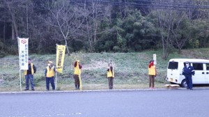写真は川原自治会の皆さんです。4月6日(月)、早朝から国道を通る車に安全運転を呼びかけました。