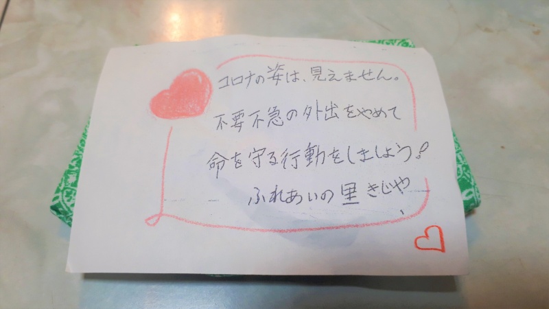 1日がかりで作成!メッセージ「コロナの姿は見えません。不要不急の外出をやめて命を守る行動をしましょう!」を添えて、雉谷地区全戸に配布しました。