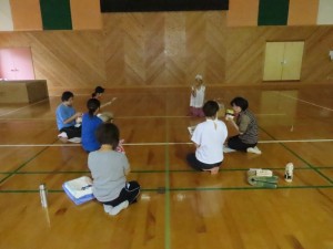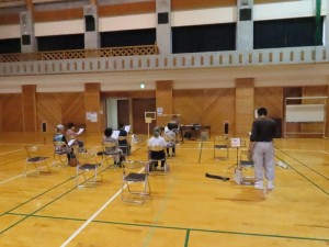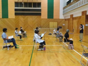 体育館の広いスペースで間隔をとり、ドアや窓を開け、暑い中マスクをしての教室。