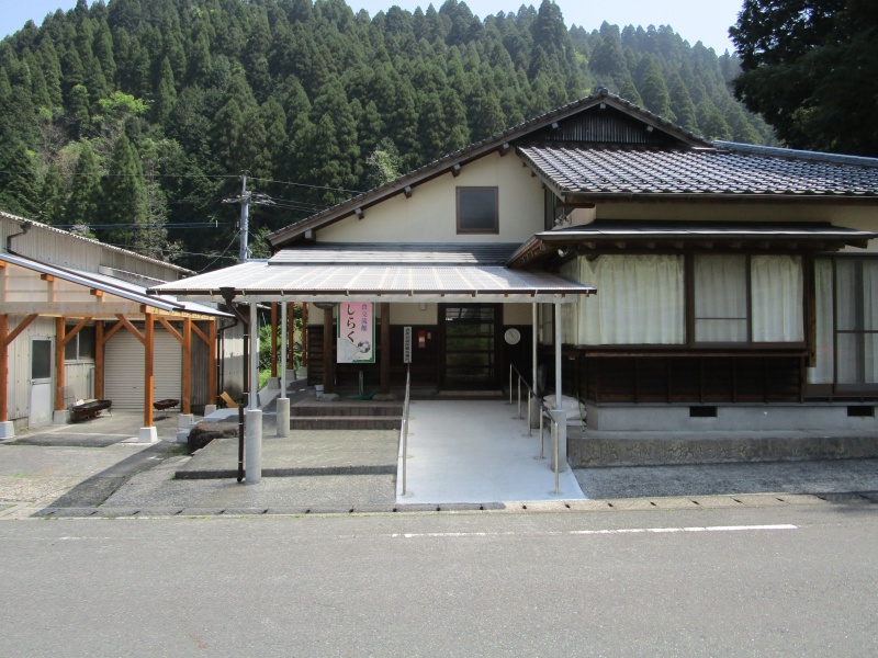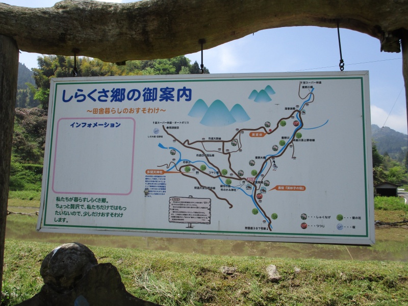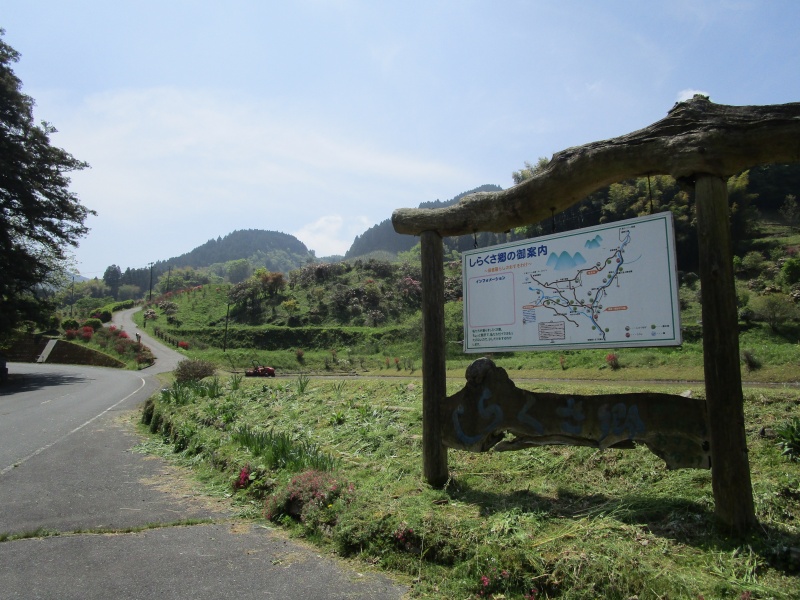 花の時期が終わらないゴールデンウィーク中。白草公民館の前には「しらくさ郷」の案内看板が立てられています。