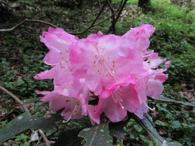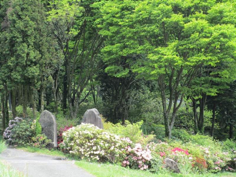 入り口には大きな石が2つ。その間から園に入っていきます。道の両端をシャクナゲに囲まれた「シャクナゲロード」ですね。いくつかのコースがありますが、自由に散策できます。色々な種類のシャクナゲがあり、なかなかの見ごたえでした。