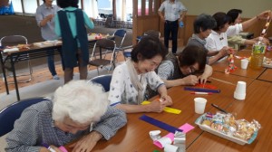 はじめに恒例となっている七夕飾り。短冊に願い事を書き、折り紙で飾りを作り、笹をきれいに飾りました。
